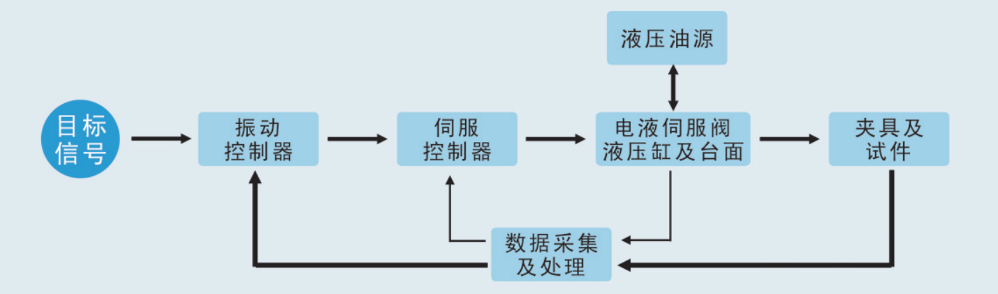 液壓振動(dòng)試驗(yàn)系統(tǒng)的主要工作原理是采用可控制的電液伺服閥,通過(guò)調(diào)節(jié)液壓油的壓力使作動(dòng)裝置產(chǎn)生往復(fù)振動(dòng)。輸入的電控信號(hào)經(jīng)放大器進(jìn)入伺服閥,伺服閥將與輸入信號(hào)成比例的液壓油輸入液壓缸,以驅(qū)動(dòng)活塞并帶動(dòng)臺(tái)面運(yùn)動(dòng)。液壓振動(dòng)試驗(yàn)系統(tǒng)能產(chǎn)生較大的推力和位移,并且在低頻的時(shí)候也可以提供較大的激振力。